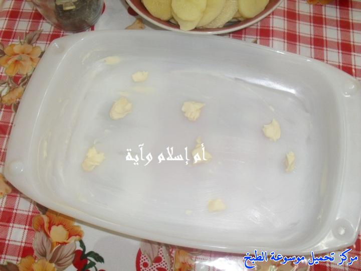 ثم نفرغه فوق البطاطا نزيد قطع صغيرة من الزبدة من الفوق ثم مباشرة الى الفرن لمدة نصف ساعع على نار متوسطة