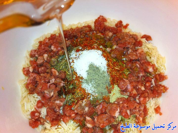 صفي الأرز من ماء النقع اتركي عليه القليل منه . في طبق عميق ضعي الأرز.اللحم . الملح . الفلفل .البهارات . الهيل . الكمون الناعم. الكمون الصحيح . العصفر والزيت . قلبي المكونات جيدا لتختلط اتركيه جانبا ليتشرب بنكهة البهارات.