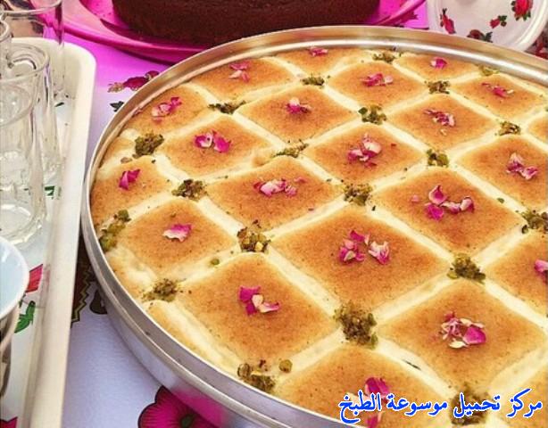 تخلط مع بعض وتوضع ف الصينيه بعد دهنها بالطحينه السائله ، ويرسم خطوط بالقشطه الطازجه او قيمر وتوضع في الفرن وبعد ان تستوي ترش بالشيره وتزين بالفستق