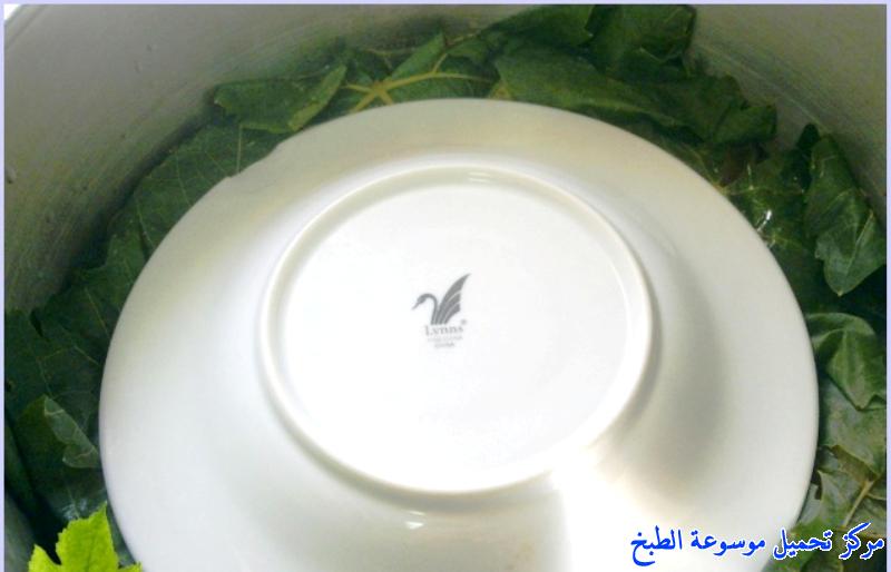 هنا وضعت ورق عنب القاسي اللي ما احتاجه فوق وحطيت صحن صيني